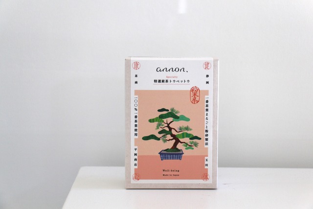 annon、さんから摘みたての一番茶を贅沢にまるごと使った粉末茶が入荷しました。 お湯や水に溶かすだけで簡単に作ることができる粉末茶◎ 全てスティックタイプで個包装になっており、 健康成分がたっぷりつまった美味しいお茶です。 パッケージも可愛いので、 お茶好きの方へのギフトにカップと一緒にいかがでしょうか? ・特選煎茶トウベットウ 玉川地区の頂に位置し、霧・水・土に恵まれた茶園「トウベットウ」から。 上品でまろやかな旨みと繊細な甘みが調和し、新緑を思わせる爽やかで瑞々しい香りが引き 立ちます。甘いスイーツのお供に、自分だけの特別な時間にもどうぞ。 原材料名:緑茶(静岡県産) 賞味期限:2027年3月
