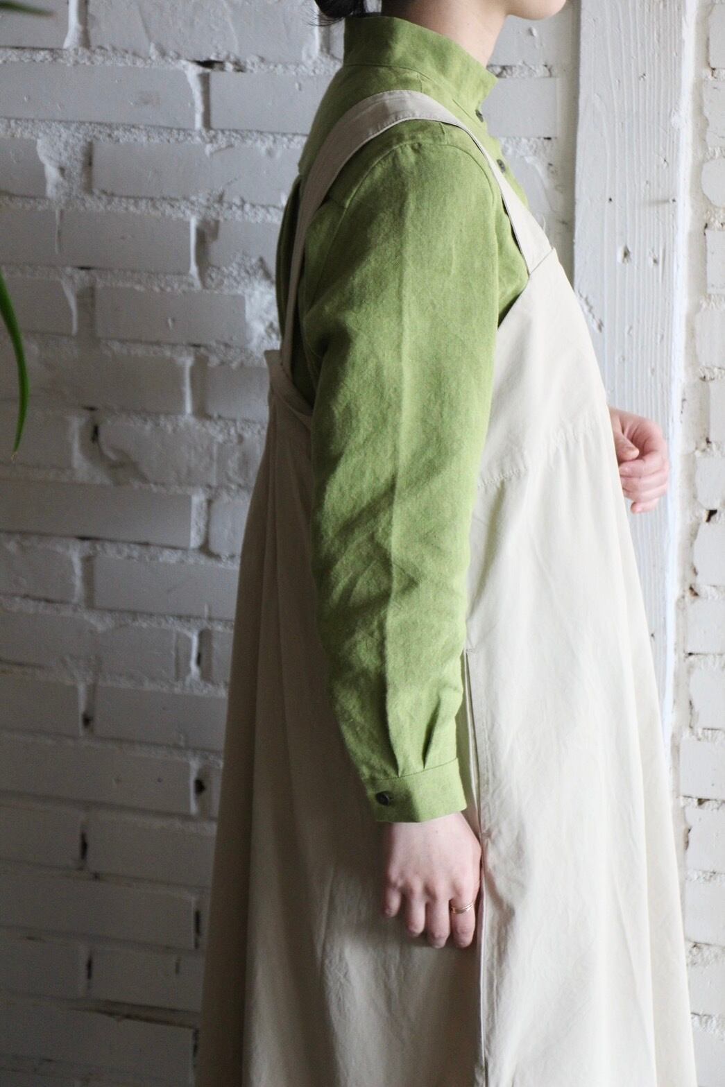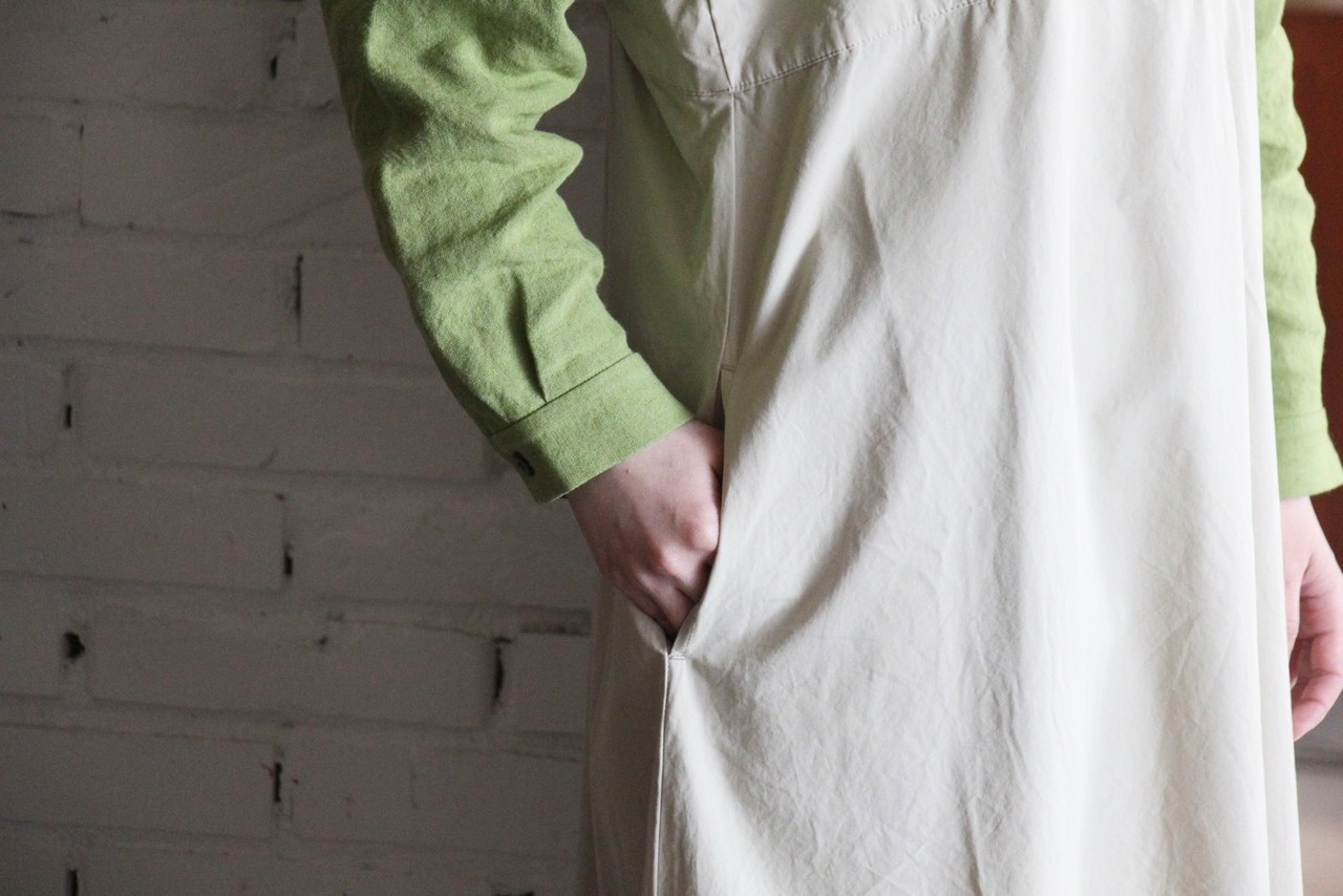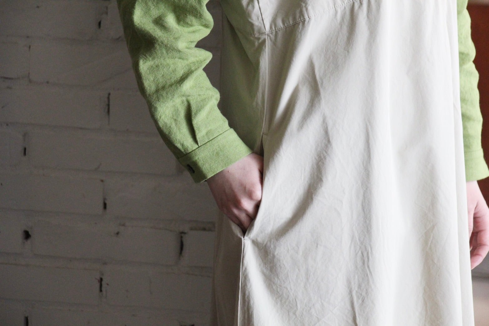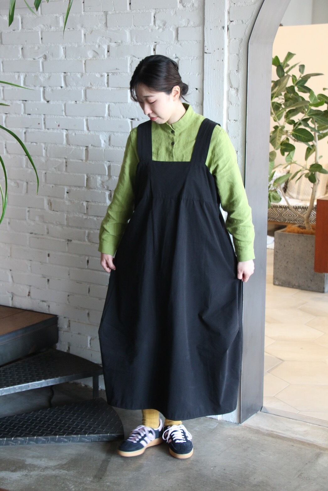 再生繊維とコットンをミックスしたナチュラルテイストのジャンバースカートです。前裾には脇にタックも入っており程よい立体感を生み出しコクーンシルエットの様に柔らかい雰囲気に◎