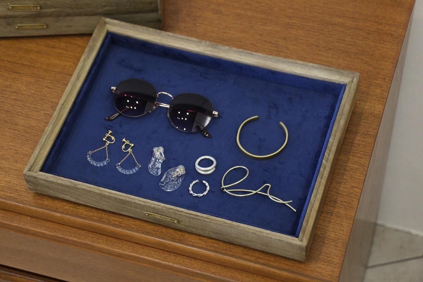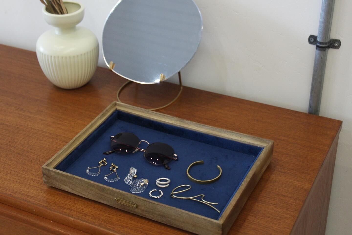 アクセサリーや腕時計、鍵やサングラスなど、毎日使う小物たちを美しく整えてくれます。ヴィンテージのような風合いの木枠と、落ち着いた内布の組み合わせが、置くだけで空間の雰囲気をぐっと引き締めてくれます。