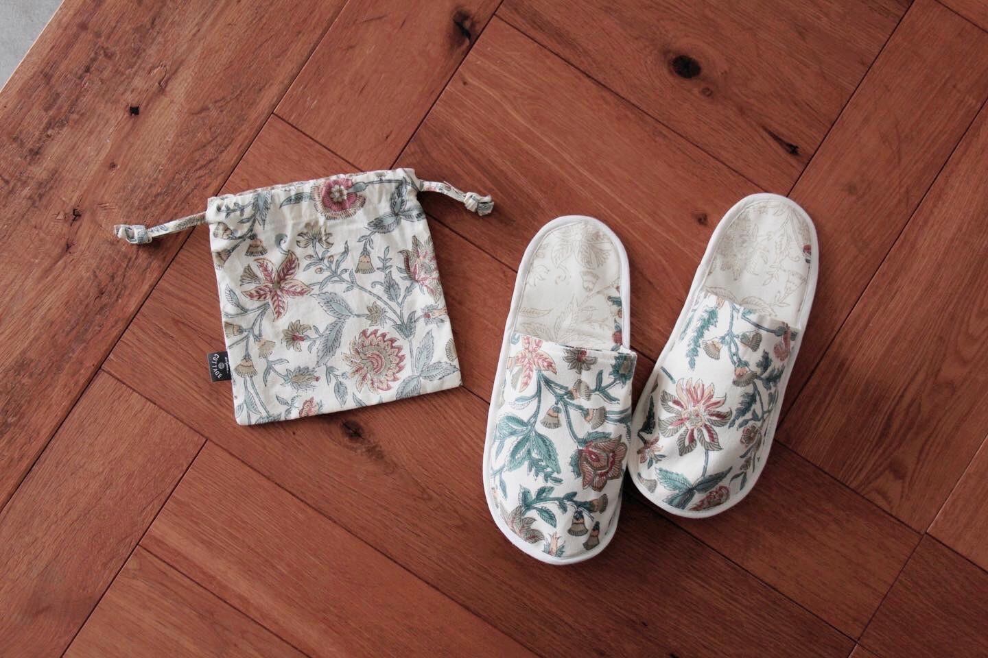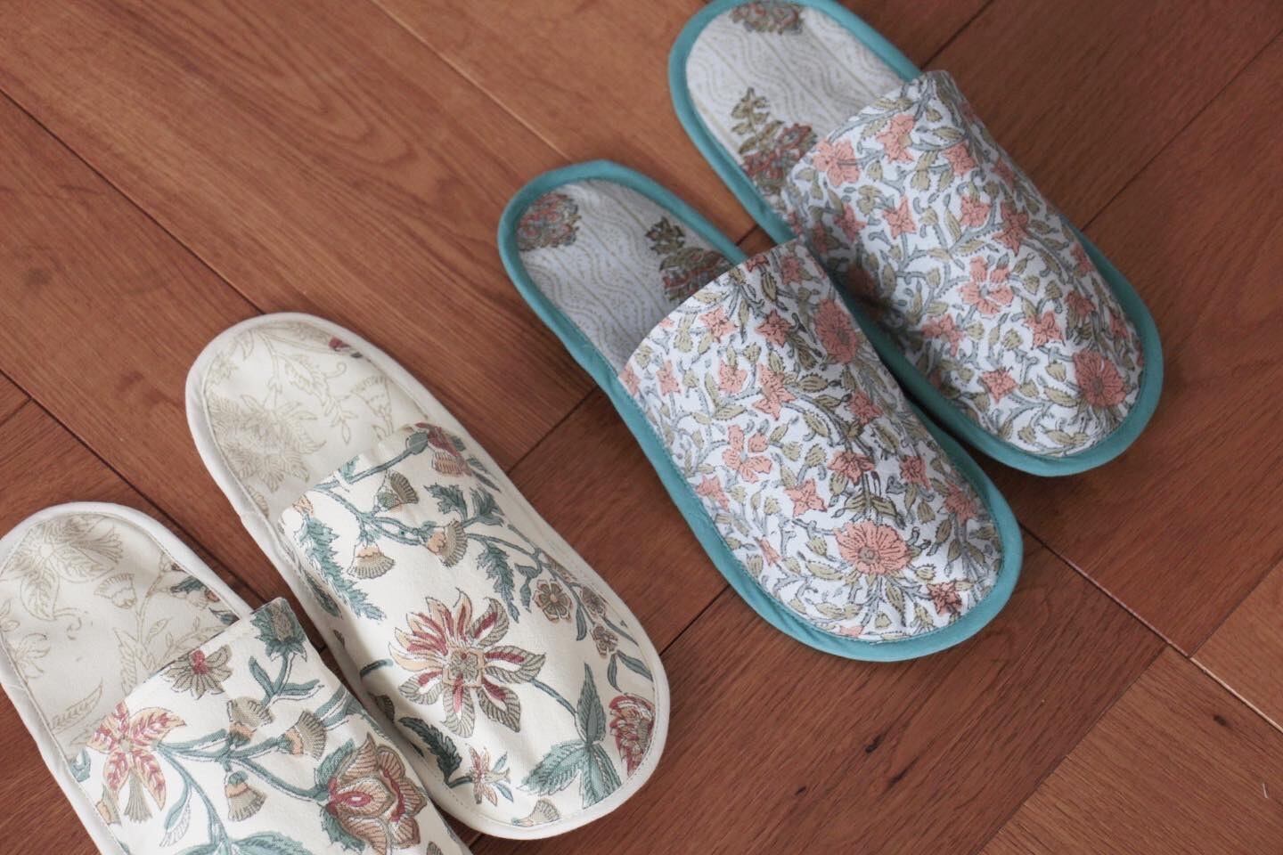インドの染色技法のブロックプリントでデザインされたスリッパ。