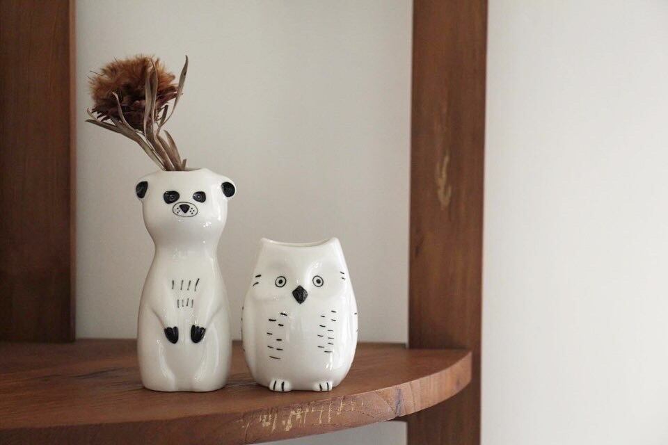 白い磁器に黒い釉薬でミーヤキャットの顔や体を描いた遊び心のあるフラワーベース。