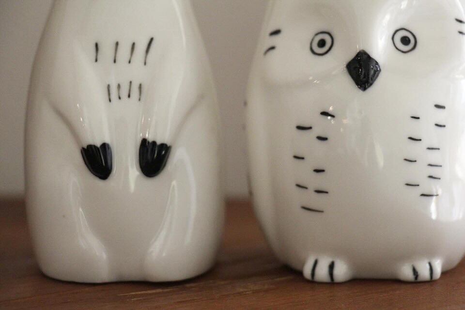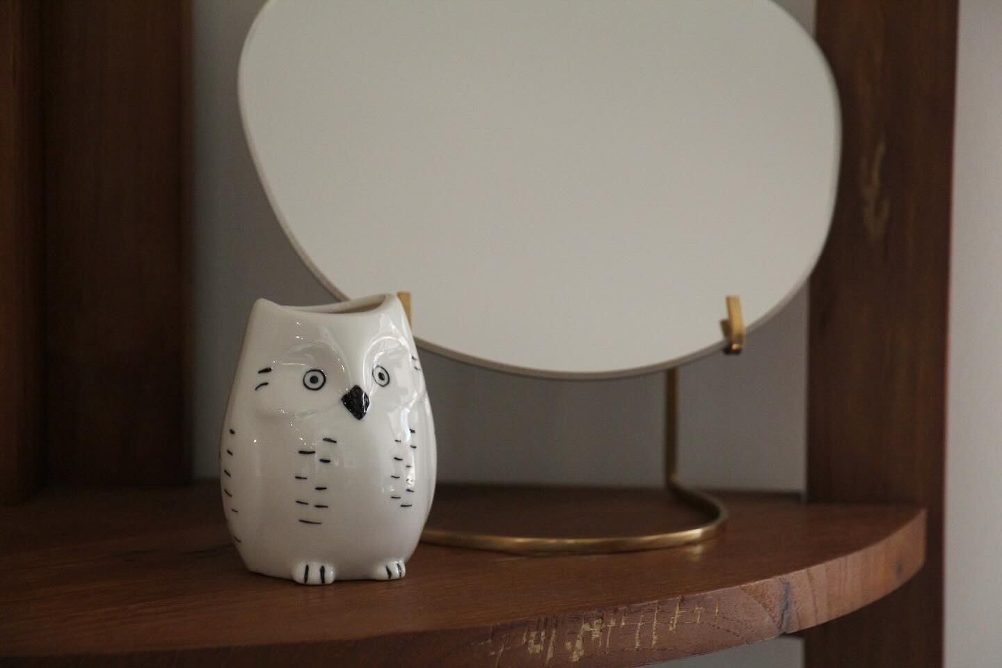 パッと見ると置物に見えますが、なんと頭ににお花を飾れるようになっているフクロウの形をしたフラワーベースてす。白い磁器に黒い釉薬でフクロウの顔や体を描いた遊び心のあるフラワーベース。ナチュラルなインテリアにも馴染みやすく飾りやすいです。もちろん置物とおしておいても◎